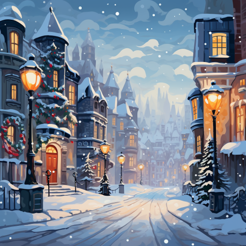 Medium Shot, front view, hyper realistic, winter, afternoon, sunny, European country style, snowy town with Christmas trees, decorations, large squares, festivals, lots of people on the streets, fairytale atmosphere, Canon EOS R5 with a 200mm lens, --style raw --v 6.1 --ar 1:1