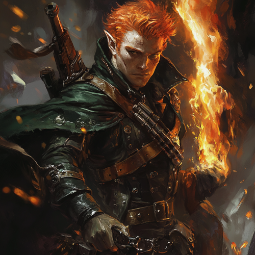 A fire genasi with smoldering pale white skin and fiery red hair, wearing a dark green cloak draped over a set of studded leather armor. He has a rugged gunslinger appearance with a flame-like rifle slung across his back, radiating heat and energy. His face is stern and focused, with an air of danger, set against a backdrop that blends Dungeons & Dragons fantasy with a Western frontier style. The leather armor is detailed with metal studs, and his pose exudes confidence, ready for action
