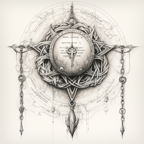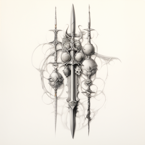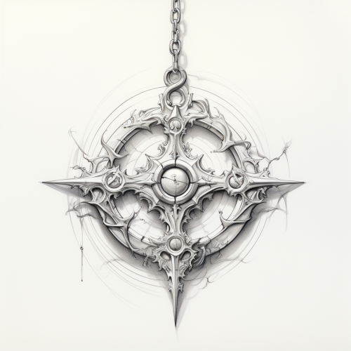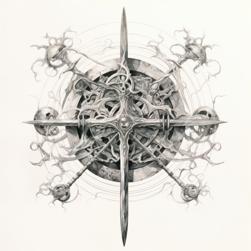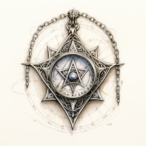 amullet with atack symbol, round, six swords, john howe and alan style, pencil sketch