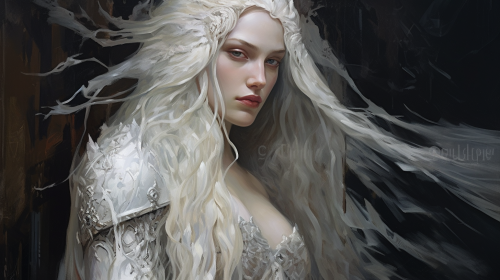 thick impasto, the white women of the fantasy game, in the style of tanya shatseva, dark silver and beige, realistic attention to detail, nightcore, comiccore, brooding mood, alan lee --ar 16:9 --v 5.2