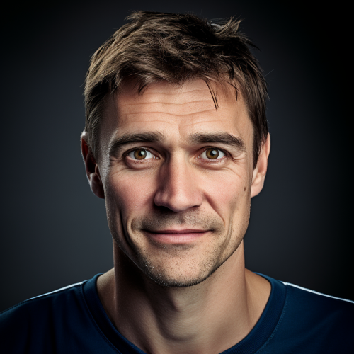 very detailed headshot from neck up fitting all of head and hair in frame wearing a Ice Hockey Jersey, Eastern European Male Ice Hockey player aged 35, He has medium hair. His face is oval-shaped and he has a teenage look. His eyes are large, with thin eyebrows that give him a happy and fun expression. He has a large nose and lips.