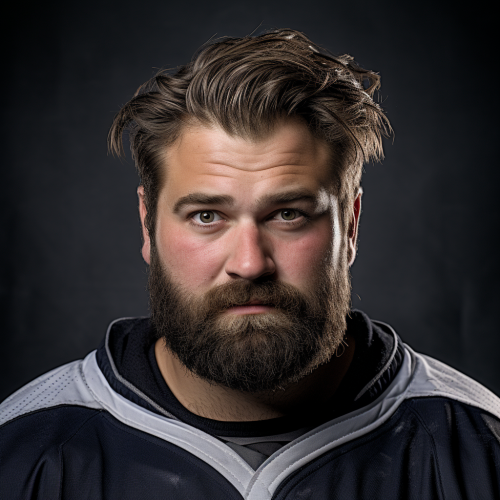 very detailed headshot from neck up fitting all of head and hair in frame wearing an Ice Hockey Jersey,german Ice Hockey player aged 29. He has a cool haircut. His face is slim with a stern look. His eyes are small, with bushy eyebrows that give him a determined and tired expression. He has a small nose, and his lips are smiling. He has a big beard.