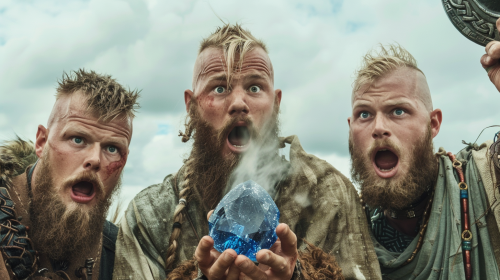 3 viking acting shocked and curious, looking at the camera, one has abrown beard, one a blond beard the otehr has none, the sky is overcast behind them and they look puzzled and cifused looking at the camera, the middle viking is holding up the blue saphire stone, it has steam coming off it and looks like it is worth a lot of money --no text --ar 16:9 --style raw --v 6.0