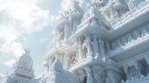 close up shot of open roof beautiful white indian temple. The temple is intricately detailed. Day time view. A ultra realistic photograph of The image was captured using a Canon EOS R5 with 50mm. --ar 16:9