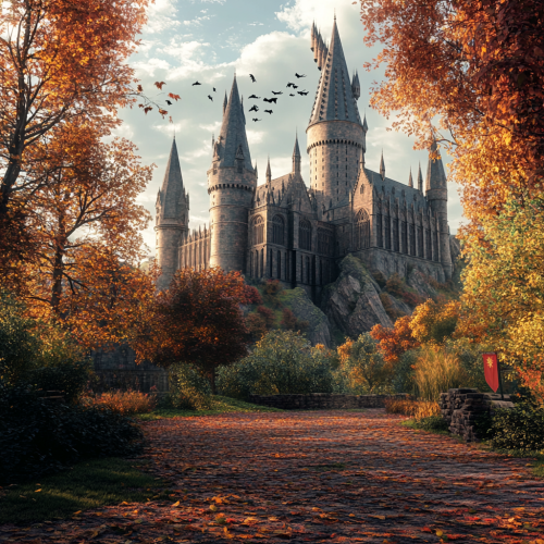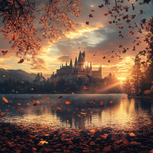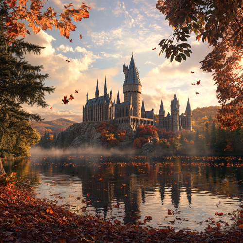 Create a high-resolution, hyper-realistic scene of Hogwarts in the fall. The mood should feel both magical and serene, as if capturing the essence of a crisp fall day at Hogwarts.