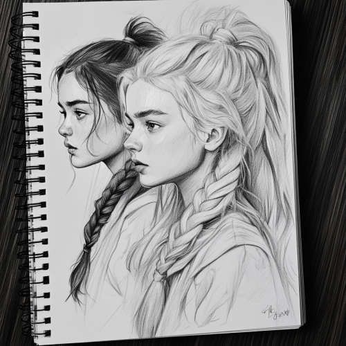 A pencil sketch of three Hogwarts studens on slytherin college 12 years old girl, one girl is pale skinned black wavy hair dressed elegant chifon black evening dress with lace sleeves,second girl have pink hair on elegant bun dressed on dark purple velvet evening drees, three girl have platinum blonde hair on braid dressed on emerald green elegant dress, Medium portrait Shot , on a spiral page notebook , in the style of realistic shaded pencil sketch,with visible pencil sketch marks --ar 1:1 --v 6.1