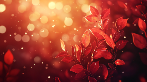 collection of red and orange leaves against a blurred background with a gradient from dark red at the top to lighter red in the center, creating a bokeh effect with soft circles of light. The leaves are arranged around the edges of the image, leaving the central part more open, which draws attention to the play of light there. --ar 16:9