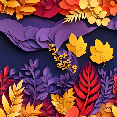 A paper sculpture diorama of fall time leaves, The color scheme includes orange, yellow, purple, red, and gold, It was created in the style of Eiko Ojala --tile