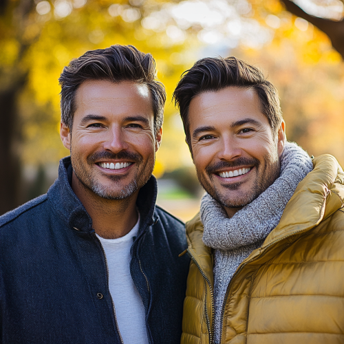 two men are smiling - they are standing outside in a park - like a christmas card image - fall leaves - one of the men is wearing a yellow band with three diamonds set in the band. the ring is clear.