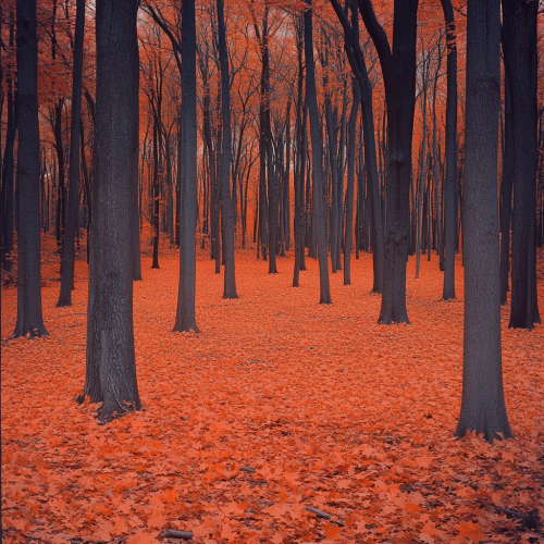 A dense maple forest in autumn, the entire scene filled with a vibrant orange hue. The ground is completely blanketed in a thick layer of fallen orange leaves. The maple trees are in full fall foliage, creating a warm, monochromatic landscape. The image has a moody, ethereal atmosphere, with soft, diffused lighting that accentuates the autumnal colors. High detail, photorealistic, 8K resolution.
