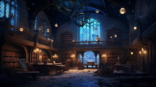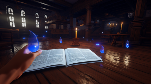 sitting in a room like Hogwarts Castle and reading the newspaper from a first-person perspective. Small few blue water glowing balls floating in the air nearby. The room was in a library, with a fireplace, a ladder, and simple Windows --aspect 16:9