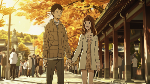 A man and a woman are holding hands, on the left is a tall Japanese 21yo man wearing a down jumper, on the right is a slender 20yo woman wearing mini shorts and a white coat, on the left The man on the right has double big brown eyes and a tall nose, and has long legs.The woman on the right has double big brown eyes, a high nose, and a beautiful face with the corners of her mouth turned up.She is smiling and has slender legs.At a Japanese shrine. There are many worshipers around, cinematography, --ar 16:9 --style raw --v 6.0