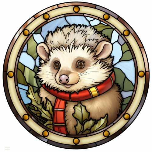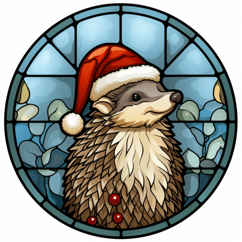 a cute headgehog at christmas: stained glass: round: white background