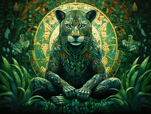 the spirit of the jaguar intertwining with a mayan spiritual woman in het thirtees, they are in the jungle, there is a large campfire and there are huge emerald crystals --style raw --ar 4:3
