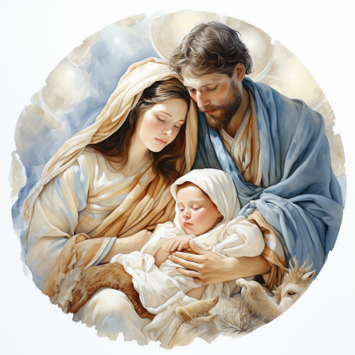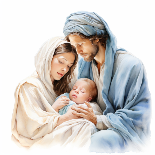 holy family, nativity, beige and light blue, white background, hyperrealism, smooth gradients, ultra detailed, photorealistic rendering, isolated on white background, super clear, high quality, oil painting and watercolor