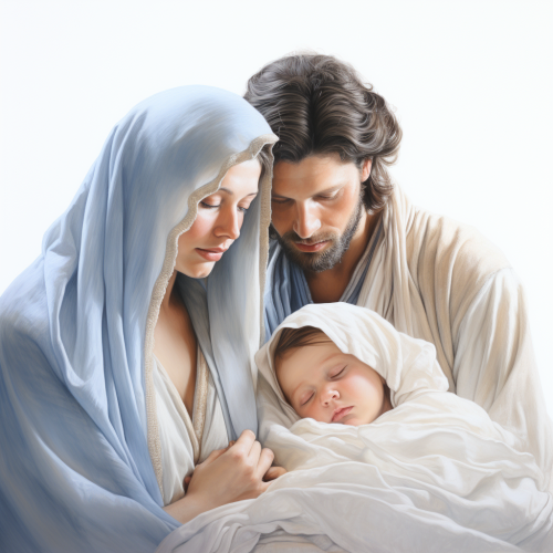 portrait of a holy family, nativity, beige and light blue, white background, hyperrealism, smooth gradients, ultra detailed, photorealistic rendering, isolated on white background, super clear, high quality, oil painting and watercolor