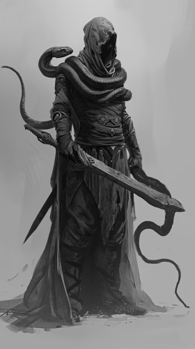 A concept art character design. The design is of a magical warrior creature. The warrior is part snake. Their are many snakes as his arm. Holding a sword in right arm. Head wrap. Flowing dark robes. --style raw --ar 9:16 --v 6.0