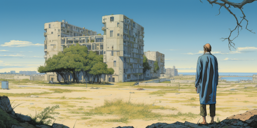 a homeless man standing and looking at a hospital, in denmark, danish hospital, art by moebius --ar 18:9