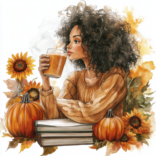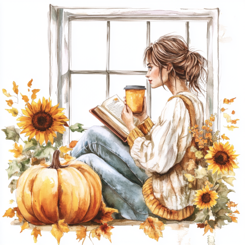 watercolor vintage beautiful woman is drinking pumpkin spice coffee drink with one hand with the book in her other hand sitting and looking out of the window surrounded by autumn flowers, pumpkin and sunflowers, png style, empty white background, defined edges of the picture