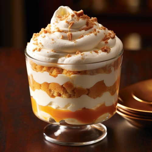 Inside a clear glass cup, capture the delectable fusion of creamy vanilla frozen custard interlaced with generous chunks of pumpkin pie. Each layer should reveal the rich contrast between the soft custard and the spicy notes of the pie filling, with glimpses of the flaky crust. Complement this dessert with a background of swirling fall leaves, perhaps a light sprinkle of nutmeg on top, all bathed in the soft glow of a setting autumn sun, evoking a feeling of warmth and indulgence.