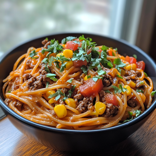 RECIPE NAME: Taco spaghetti | Amateur photo from reddit, taken with an iPhone 15 Pro. | SHOT TYPE: taken in a kitchen in front off the window on table