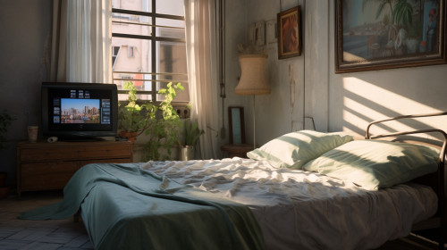 [73684a486] The walls of the large living room are made of clear glass. Opposite the bed is a large TV:: Lying on the bed, horizontal view, facing the TV --v 5.2 --ar 16:9 --c 0