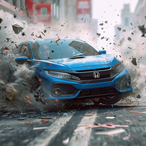 Photorealistic: Honda hatchback goes over a speed bump too fast and falls apart, Driver screaming --v 6.0