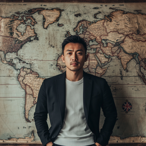 a Asian man from brunei travelling the world, he has a map that clearly marks out London, China and Hong Kong, make it fun but also hyper realistic with a Newcastle united football club vibe