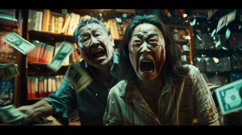 a movie still photo of a 40 years old hong kong zombie couple yelling to each others at a dramatic lighting book store, money notes everywhere, cinematic photography, --ar 16:9 --v 6.0