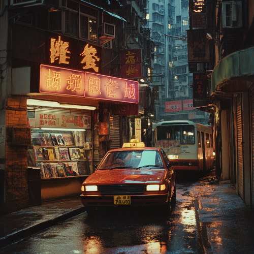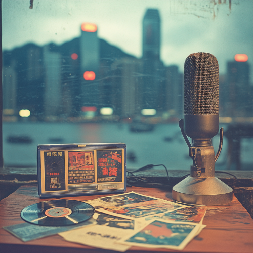 A nostalgic, cinematic photo of old Hong Kong streets at dusk, with neon signs in traditional Chinese characters glowing softly in the rain-soaked pavement. A vintage red taxi and tram pass by as faded concert posters of Leslie Cheung, Anita Mui, and Beyond are plastered on the brick walls of a narrow alley. A record store with open doors, vinyl records displayed in the window, hints at the golden era of Cantopop. The atmosphere is drenched in emotion, with the soft glow of lanterns and reflections of neon lights creating a bittersweet, sentimental mood of a bygone era.