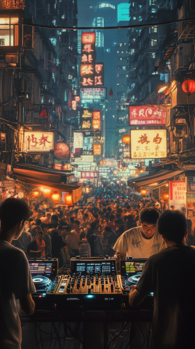 in a busy night of Hong Kong back in 1980s, 2 DJs playing music on the street with people partying and dancing in front of them. make the image vintage --ar 9:16 --v 6.1