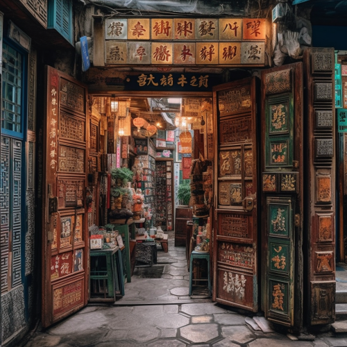 Imagine a bustling Hong Kong Mahjong shop tucked away in a narrow alley, its vibrant signboard adorned with traditional Chinese characters that spell out the shop's name. The entrance is marked by a pair of intricately carved wooden doors, displaying auspicious symbols of luck and prosperity. --s 750 --v 5.0
