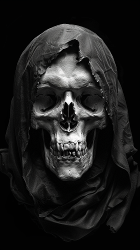 hooded skull . ultra realistic , black and white , cinematic light , high contrast , ink drawing --ar 9:16