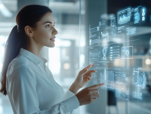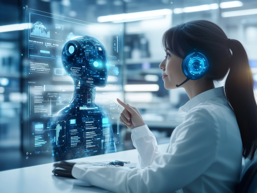 Conversational AI Engaging Customers: A business professional interacting with an AI-powered chatbot on a sleek, modern screen, clear and intuitive user interface with clean lines, real-time conversation with engaging text bubbles, bright office setting with subtle technology elements, focus on the seamless interaction and efficiency of AI-driven customer support, hyper realistic photograph, Sony A7R IV, sharp detail, clean post-processing for a polished, professional look --ar 4:3