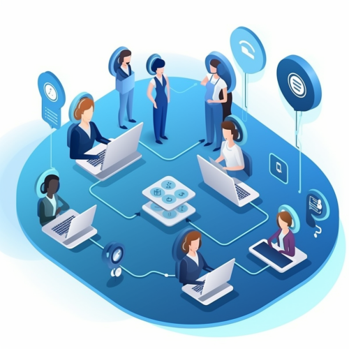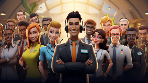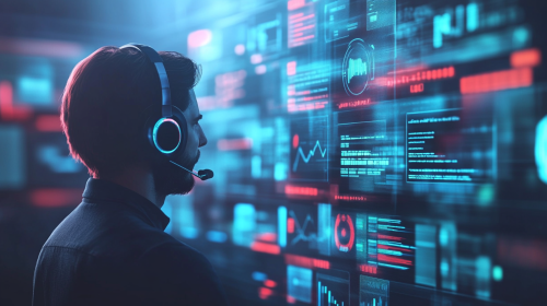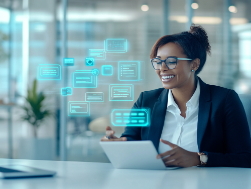 background image for a customer support site, convey modern state of the art customer service, digital age with mobile devices and connectivity, feature series of tiled screen panels, realistic 3d illustration --ar 16:9