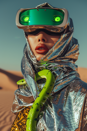 A futuristic Muslim Arab woman in future year 2580, she is wearing a reflective chrome veil, she is wearing futuristic AR goggles with green lens, a dramatic pose, she has a bright green snake around her neck, Vogue editorial in desert, fashion photography, cinematic lighting, high contrast lighting --ar 2:3 --no patterns --v 6.0