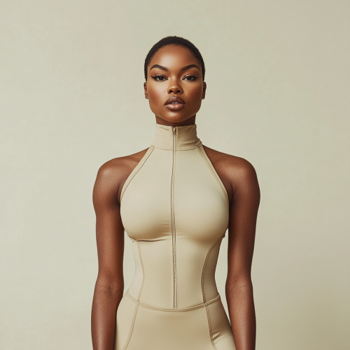 A beige, sleeveless, one-piece activewear jumpsuit worn by a fit female model, featuring a high neckline with a small collar, and a front zipper running from the neck to the mid-torso. The jumpsuit is form-fitting, hugging the body’s curves from shoulders to thighs, with a slight flare at the ankles for added style. Made from smooth, stretchy fabric for a sleek and athletic appearance. The model poses confidently in a well-lit studio with a plain, light background, highlighting the jumpsuit’s minimalist, modern design
