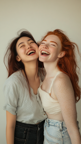 Full-body, stock photo quality image of two young women, one Asian and one red-haired Caucasian, embracing each other happily and looking upwards with joyful expressions. Both are dressed casually, standing together in a natural pose. Soft, natural lighting with a clean, minimalist background, capturing a cheerful, friendly mood. High-resolution, professional photography style similar to Shutterstock, with balanced, vibrant colors for an inviting, upbeat atmosphere, --ar 9:16