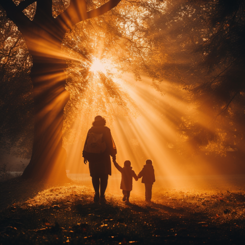 An inspiring image captures the essence of being motivated to live an full and active life . A 50 years old woman is shown walking with her grandchildren in a park. Rays of orangey light shine down, symbolizing the energy and positivity that her active life brings. The atmosphere is energetic and uplifting, capturing the spirit of motivation that drives a person to embrace regular activity. Photography (Exercise Motivation), captured with dynamic angles and natural lighting, aperture f/2.8, shutter speed 1/320, ISO 400 --v 6.0 --s 250