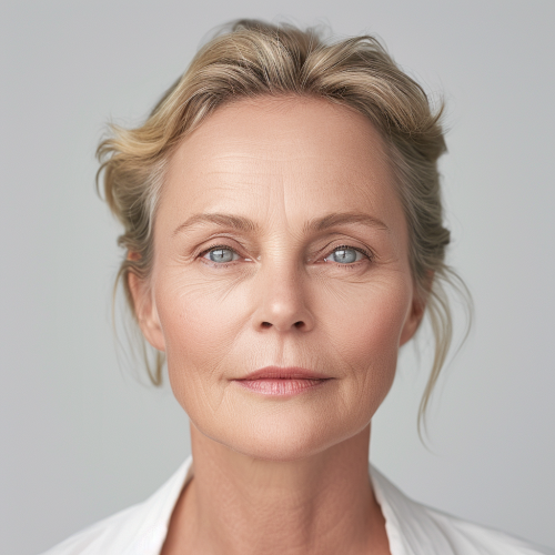 chick 50 year old woman with brown hair celebrating that she just got menopause. Setting is a mephis design studio with abstract props in balloons. Lighting is bright and studio colors are light