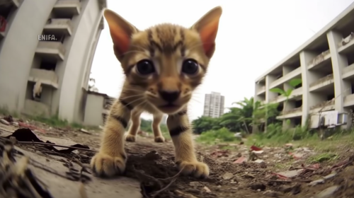 Wide angle lens first-person shooter view from an SOF rescuing an extremely cute looking kitten from the ruins of a destroyed streets in singapore, themes of live found footage, shot with Go Pro Hero10, circa 2022, --ar 16:9 --stylize 750 --v 5.1