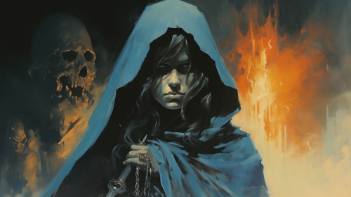 1970's dark fantasy cover art by Frank Frazetta, dungeons and dragons style drawing of Githyanki, burn mark on left cheek, cloaked, blue aura, soul knife, hand knife, blue blade of fire, black robes, hooded with minimalist far perspective --ar 16:9 --style raw
