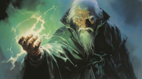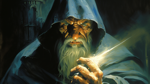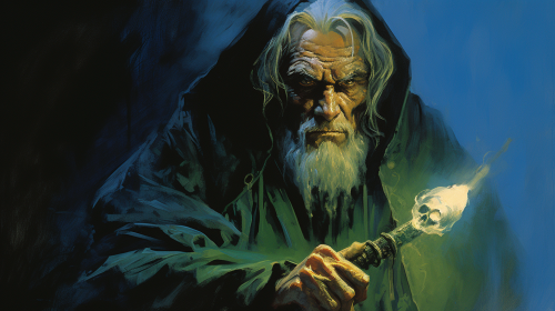 1970's dark fantasy cover art by Frank Frazetta, dungeons and dragons style drawing of an old man with reptilian like features with green skin, hes very old and has burn mark on his left cheek, he wears cloaked black hooded robes, blue aura, soul knife, hand knife, blue blade of fire, he is Gith with green scaly skin --ar 16:9 --style raw
