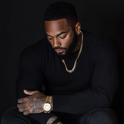 A black man dressed in an all black sweater, sitting in a confident and intense pose. He is DARK SKINNED AND has close cut, fine silky hair. He has a beard and detailed tattoos on his neck and hands ONLY! His edge up is sharp and perfect. He is wearing a gold watch on his wrist and Cuban chain.