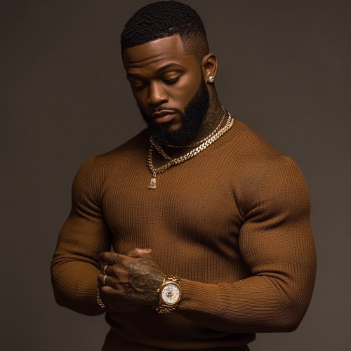 A black man dressed in an all brown sweater, standing in a confident and intense pose. He is DARK SKINNED AND has close cut, fine silky hair. He has a beard and detailed tattoos on his neck and hands ONLY! His edge up is sharp and perfect. He is wearing a gold watch on his wrist and Cuban chain.