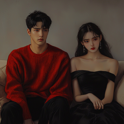 a guy about 25 years old, Korean appearance, dark hair, in a red sweater, sitting on a light sofa, serious look, next to him sits a girl about 19 years old in a black strapless dress, hair gathered, sad, evening, dark --q 2