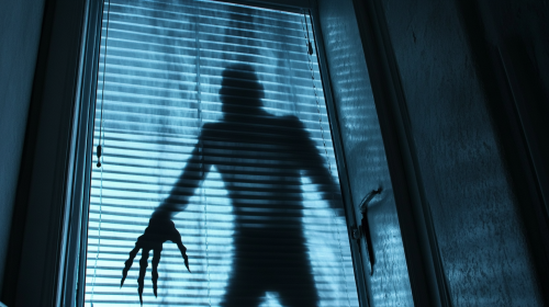 horror image that shows a door that has a tall window covered by blinds, but a silhouette of a large creepy man is showing up as a shadow on the blinds, shows the creepy man has a knife in the shadow, --ar 16:9