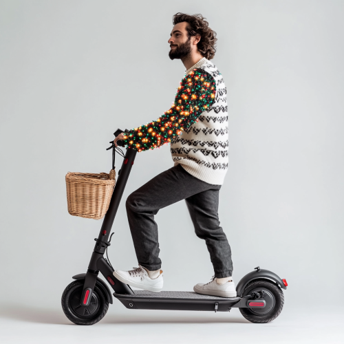 Full side view of a stylish man riding a small, trendy electric scooter with a basket on the front, wearing an eye-catching, quirky Christmas ugly sweater adorned with small, twinkling lights, without a helmet. The sweater has a fun, festive pattern, and the man exudes a cool, laid-back vibe. The entire scooter is visible, showcasing its unique, stylish design against a plain white background with no other elements. The glowing lights on the sweater pop against the clean white backdrop, giving an editorial, polished look
