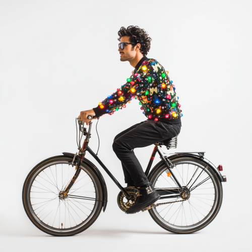 Full side view of a stylish man riding a bicycle, wearing an eye-catching, quirky Christmas ugly sweater adorned with small, twinkling lights, without a helmet. The sweater has a fun, festive pattern, and the man exudes a cool, laid-back vibe. The entire bicycle is visible, captured in a clean, editorial style against a plain white background with no other elements or background distractions. The glowing lights on the sweater stand out against the white backdrop, giving a polished, professional look