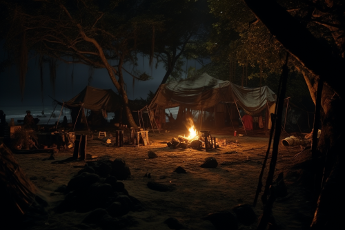 Dvd screengrab of an abandoned tropical beach campsite for a small group of college scientists, 80s horror movie vibes, night, high detail, atmosphere, cinematic light, ultra realistic, hyper detailed, wide angle, 80's horror movie, sharp focus, lighted by roger deakins, shot on 70mm film, --ar 3:2